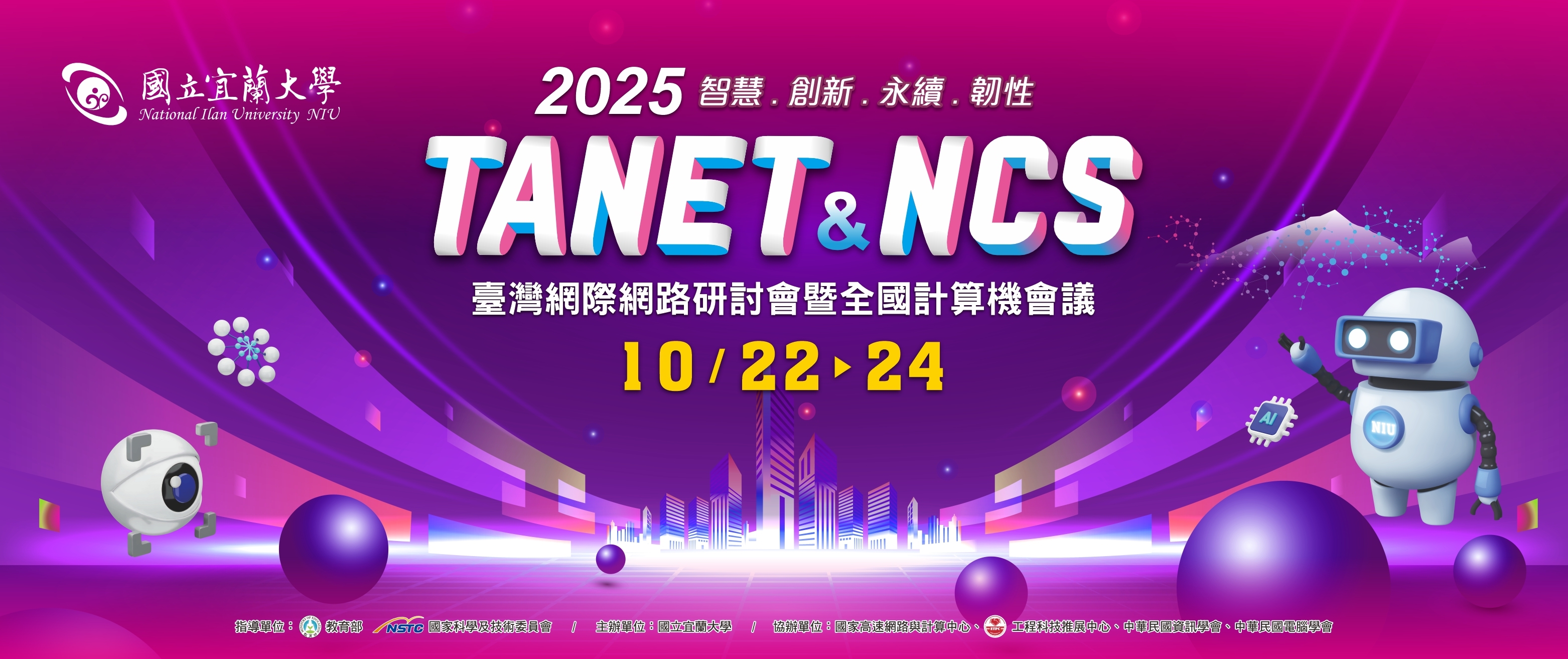 2025年台灣網際網路研討會(Taiwan Academic Network Conference, TANET 2025)暨全國計算機會議(National Computer Symposium, NCS)由國立宜蘭大學主辦,謹訂於2025年10月22日至24日於國立宜蘭大學盛大舉行。